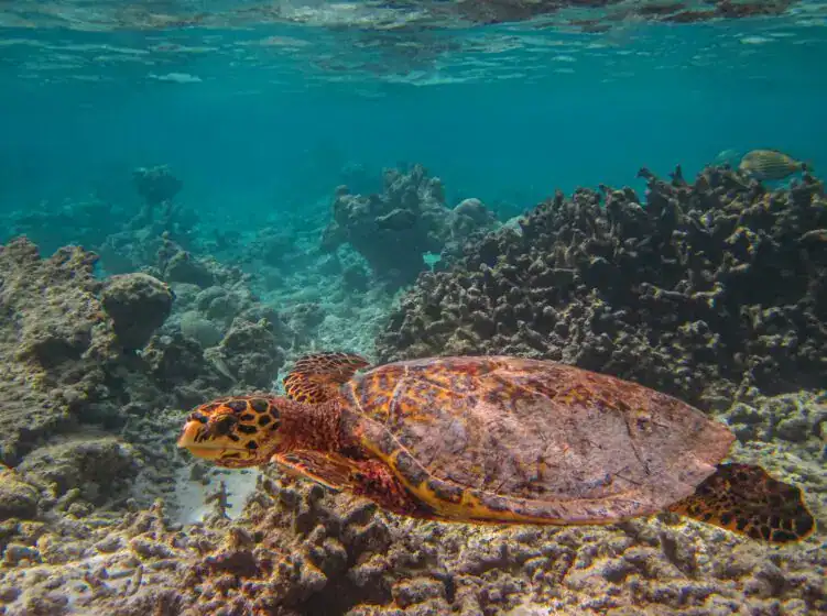 Slip into the warm, clear water and snorkel along vibrant coral reefs. Watch green sea turtles glide gracefully beneath you and spot schools of colorful fish darting through the sunlight.