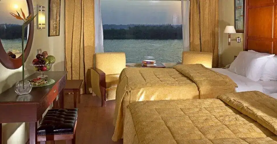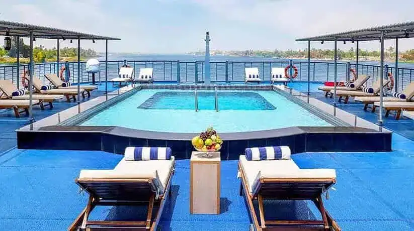 Guests enjoy air-conditioned cabins, a swimming pool, sun deck, spa services, onboard entertainment, and expert Egyptologist guides.