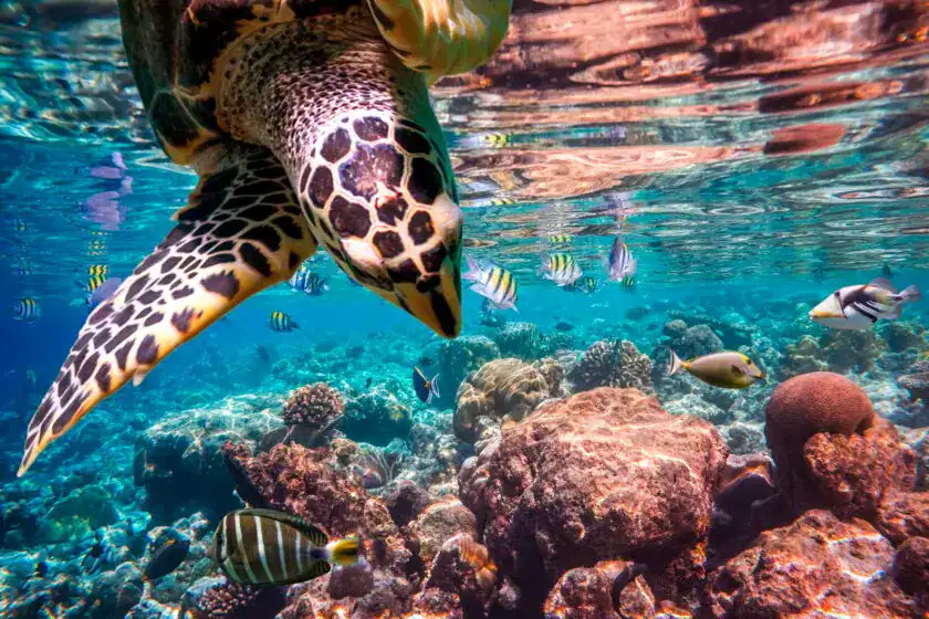 Slip beneath the surface at Marsa Mubark, where sunlight dances through clear water. Swim alongside green turtles grazing on seagrass and, if you’re lucky, spot the resident dugong, Dennis, gliding gracefully nearby.