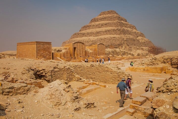 The tour includes the Pyramids of Giza and the Sphinx, Saqqara and the Step Pyramid, Memphis, and a visit to the Grand Egyptian Museum.